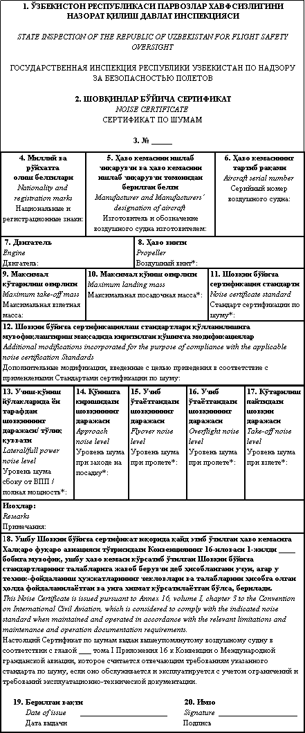 <title>&nbsp;1360-сон 20.05.2004.&nbsp;Об утверждении инструкции по выдаче сертификата по шумам на гражданские ВС Республики Узбекистан</title>