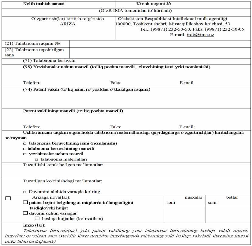 <title>&nbsp;1329-сон 22.03.2004.&nbsp;Ixtiroga Oʻzbekiston Respublikasining patentini berish uchun talabnomalarni tuzish, topshirish va koʻrib chiqish qoidalari toʻgʻrisida</title>