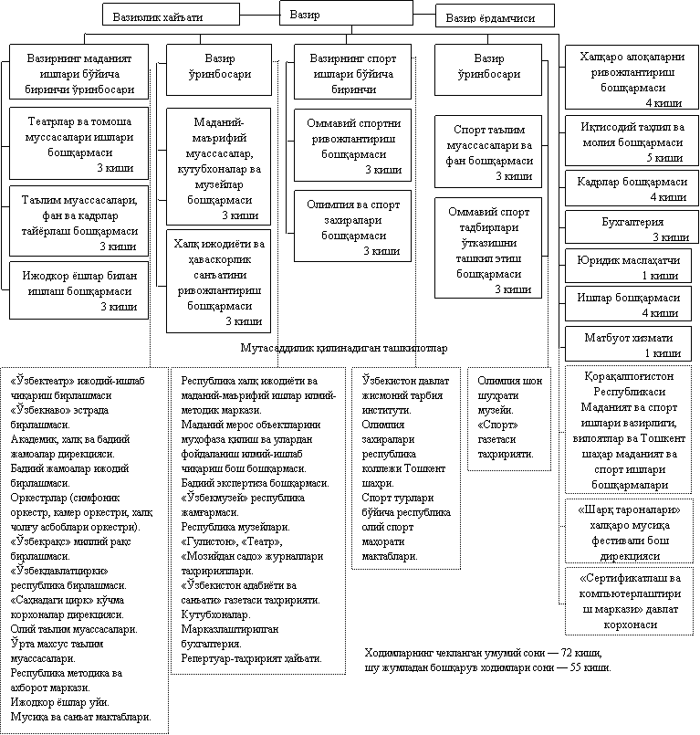 <title>&nbsp;96-сон 05.04.2005.&nbsp;Oʻzbekiston Respublikasi Madaniyat va sport ishlari vazirligi toʻgʻrisidagi nizomni tasdiqlash haqida</title>
