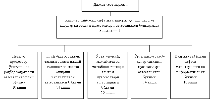 <title>&nbsp;109-сон 11.03.1998.&nbsp;Davlat test markazi tarkibida kadrlar tayyorlash sifatini nazorat qilish, pedagog kadrlar va taʼlim muassasalari attestatsiyasi boshqarmasini tashkil</title>
