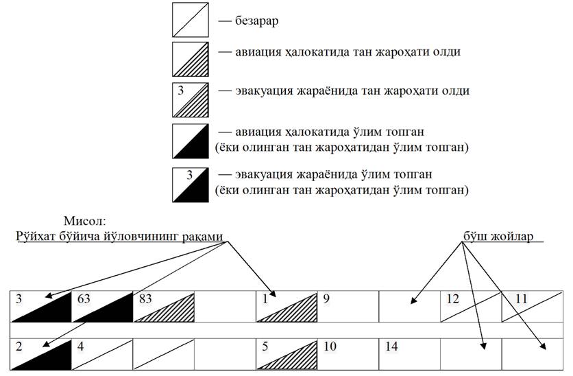 <p align="justify"><font size="2">‎‎Hodisa joyini topish vaqti, avariyadan qutqarish guruhining kelishi haqida maʼlumotlar beriladi. Yongʻinning kelib chiqish sabablari va xarakteri, uni bartaraf etish vaqti, jalb qilingan yongin oʻchirish texnikasining soni, avariyadan qutqarish ishlarining samaradorligi koʻrsatiladi. Termik kuyishga uchragan shaxslar (ekipaj aʼzolari, yoʻlovchilar, avariyadan qutqarish ishlarida ishtirok etgan shaxslar) soni koʻrsatiladi.</font></p></td></tr>